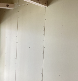 貼り終わった石膏ボードのジョイント(継ぎ目)の処理を行って、平滑にしてから塗装します。目地の部分は後に割れる事が多いです。