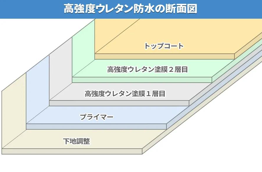 プライマーは接着剤だと思ってください。ウレタン一層目、二層目で実質の防水効果が高い材料です。これで水の侵入を防ぎます。
