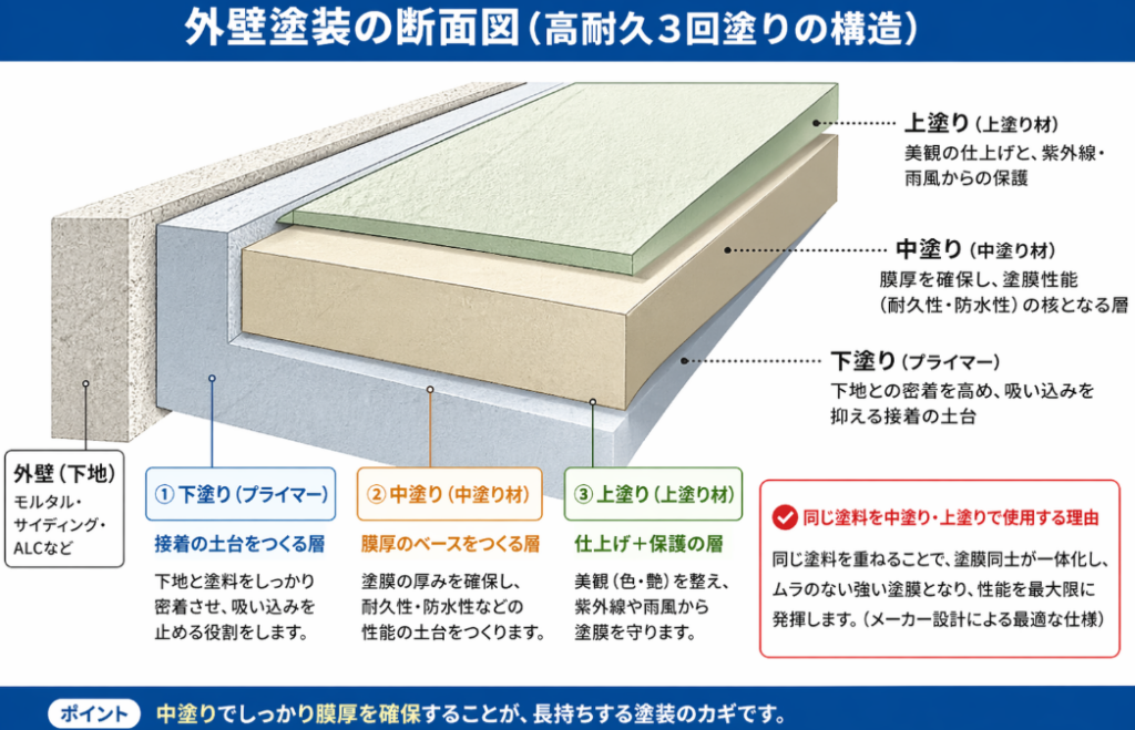 『専用中塗り材』と言うものが存在します。ベランダ床のウレタン防水に例えると分かりやすいかと思います。