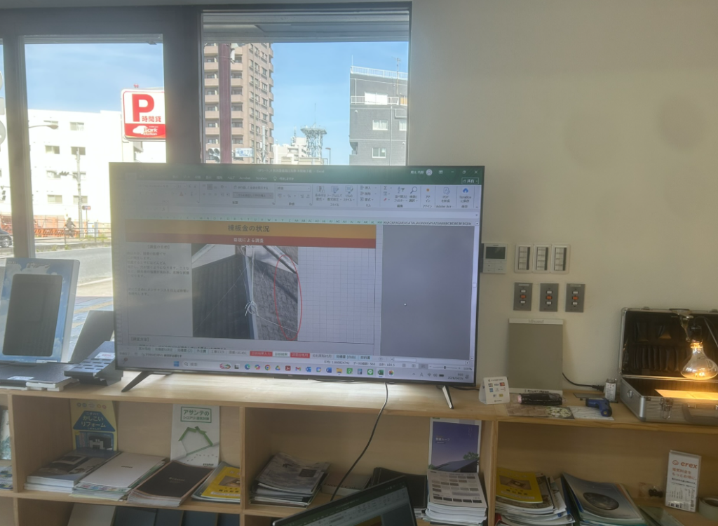 66インチの大画面で普段見られない屋根の状態を一緒に見ながら説明できます。横幅165センチ😍